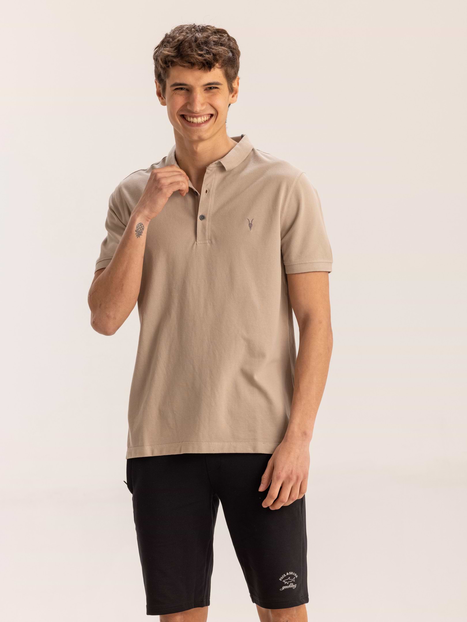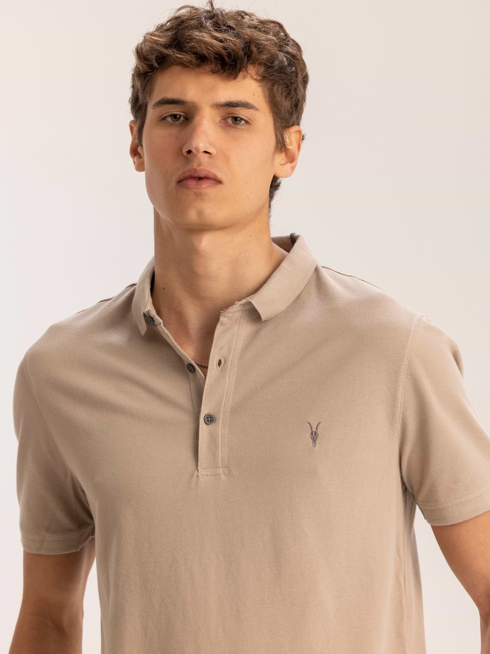 חולצת פולו קלאסית ממותג האופנה ALL SAINTS בגוון חול זהוב החולצה מאופיינת ב 3 כפתורים, 100% כותנה אוורירית ורקמת לוגו בחזית.