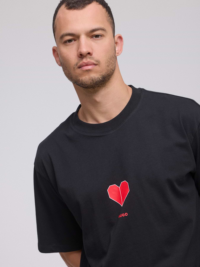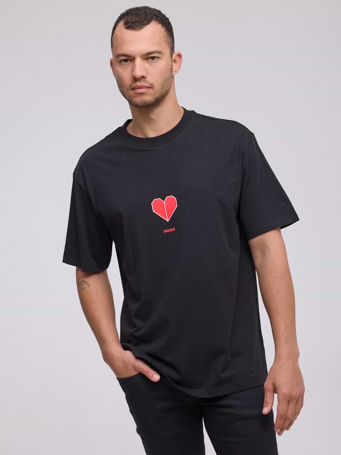 HUGO small center logo טי שירט בצבע שחור עם הדפס לב במרכז והדפס בגב