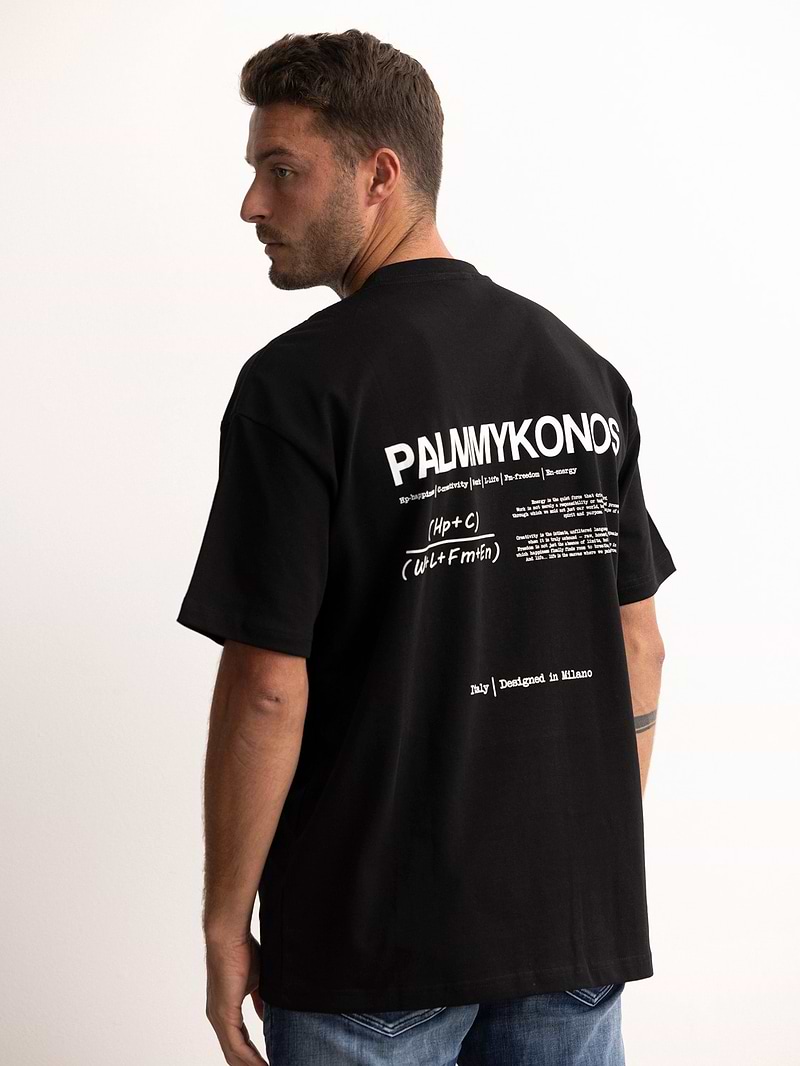 PALM MYKONOS black oversize t shirt חולצה אוברסייז בצבע שחור הדפס בחזית המוצר והדפס בגב