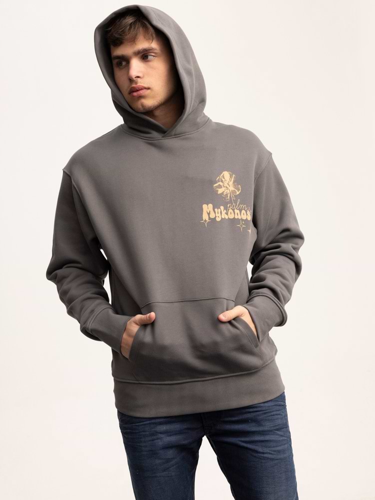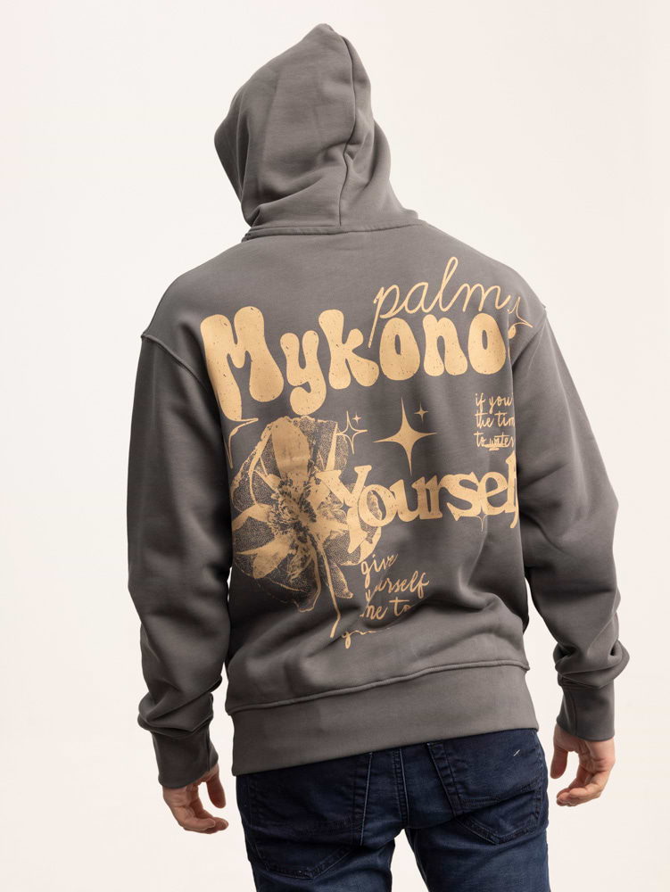 PALM MYKONOS gray oversize hoodie print flower קפוצון אוברסייז בצבע אפור עם הדפס פרח בחזית
