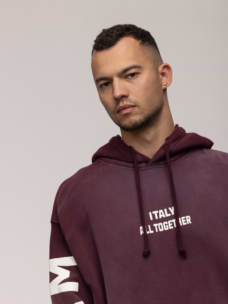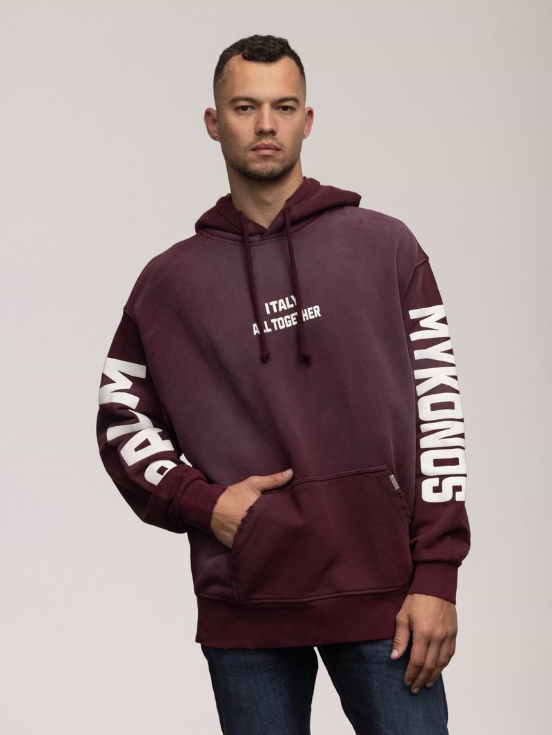PALM MYKONOS hoodie super vintage bourduex קפוצון סופר וינטג’ עם הדפס בחזית ובשרוול בצבע בורדו