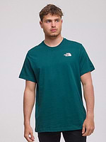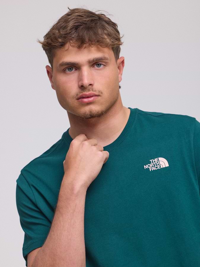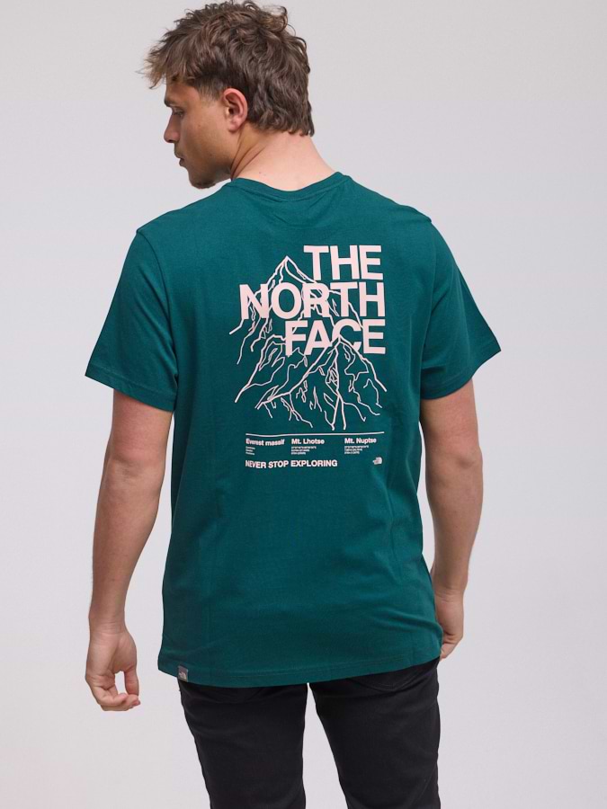 THE NORTH FACE logo t shirt חולצה בצבע ירוק בקבוק עם לוגו קטן והדפס הרים בגב