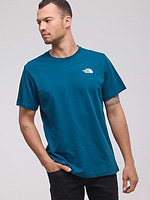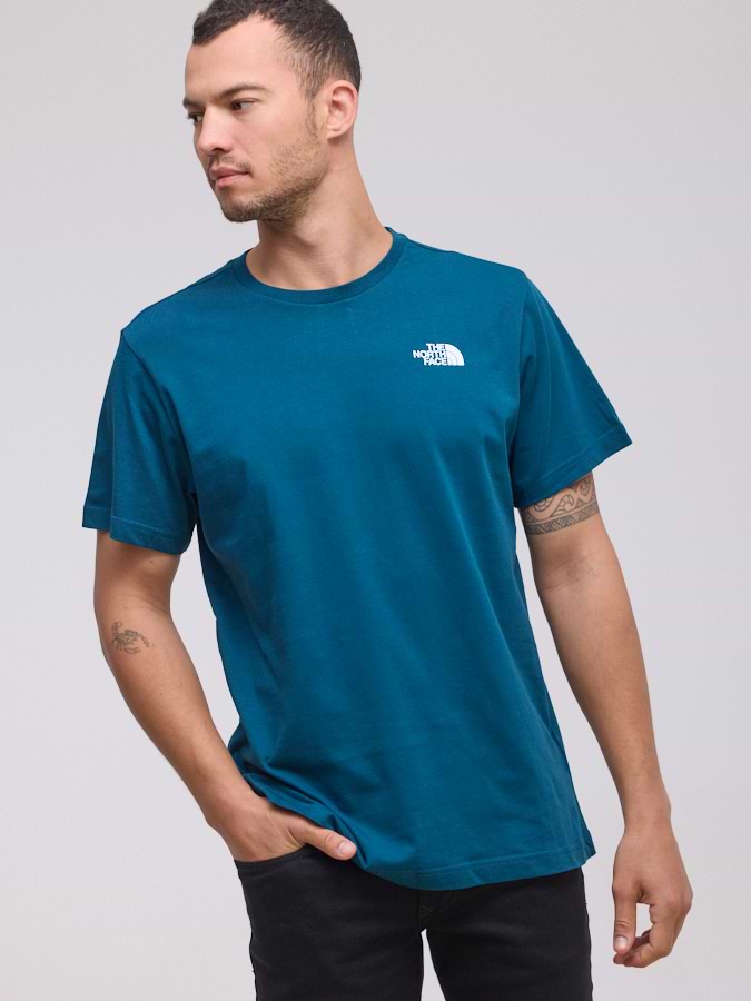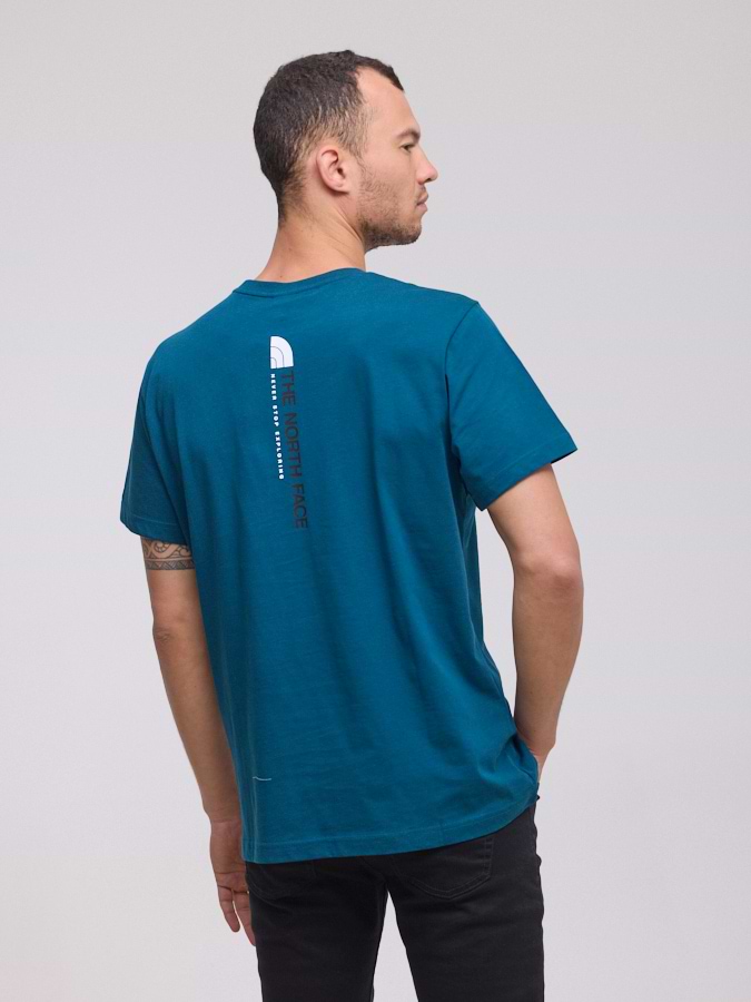 THE NORTH FACE logo t shirt חולצה בצבע כחול פטרול עם לוגו קטן צידי והדפס אורכי צר בגב