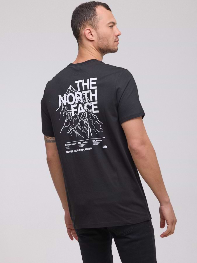 THE NORTH FACE logo t shirt חולצה בצבע שחור עם לוגו קטן צידי והדפס הרים בגב