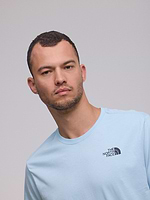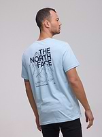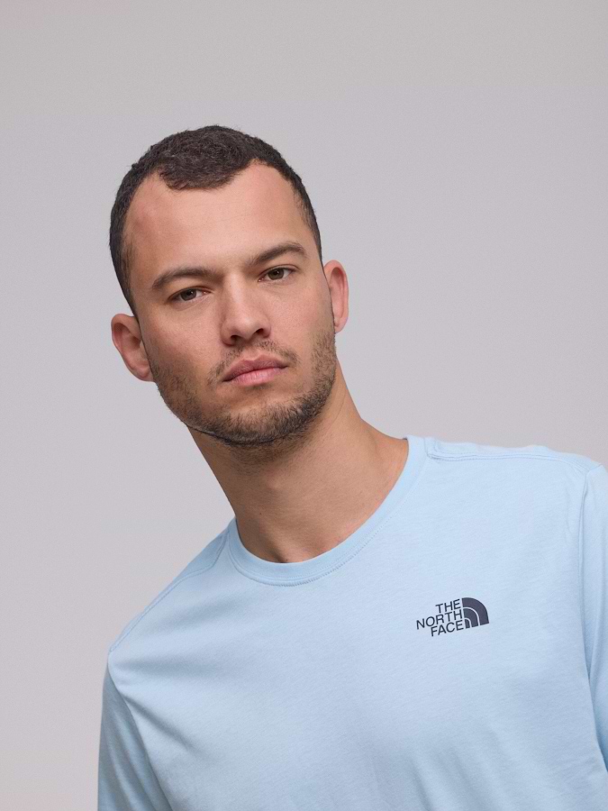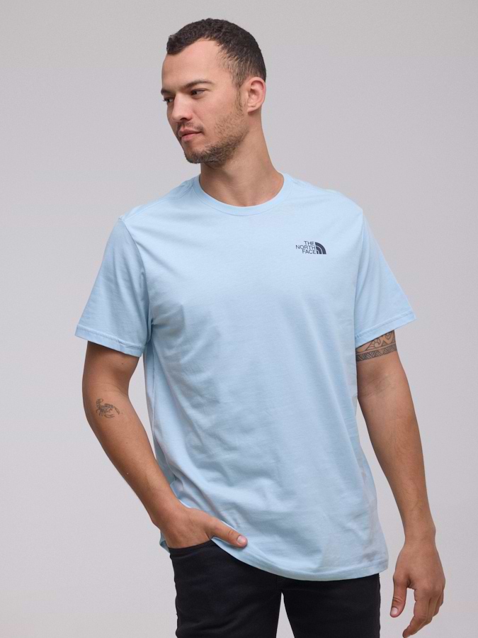 THE NORTH FACE logo t shirt חולצה בצבע תכלת שמיים עם לוגו קטן צידי והדפס הרים בגב