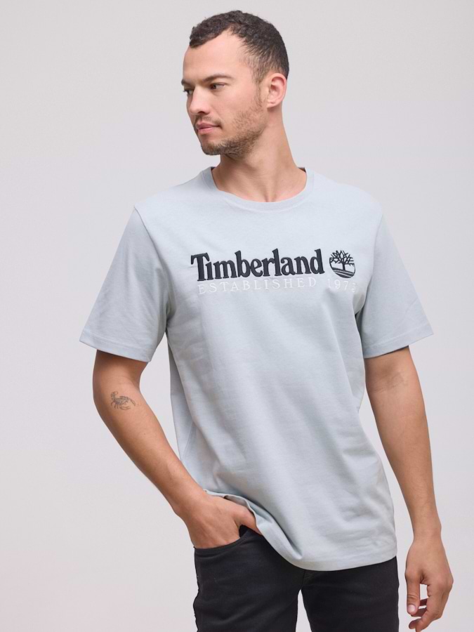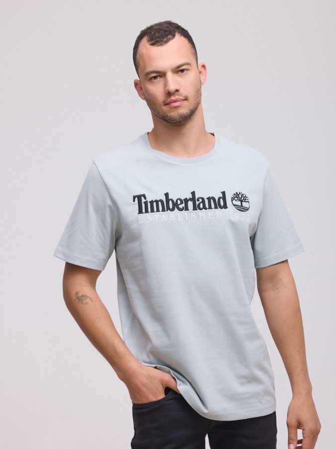 TIMBERLAND light gray big logo t shirt חולצה בצבע אפור בהיר עם רקמה שחורה בחזית המוצר