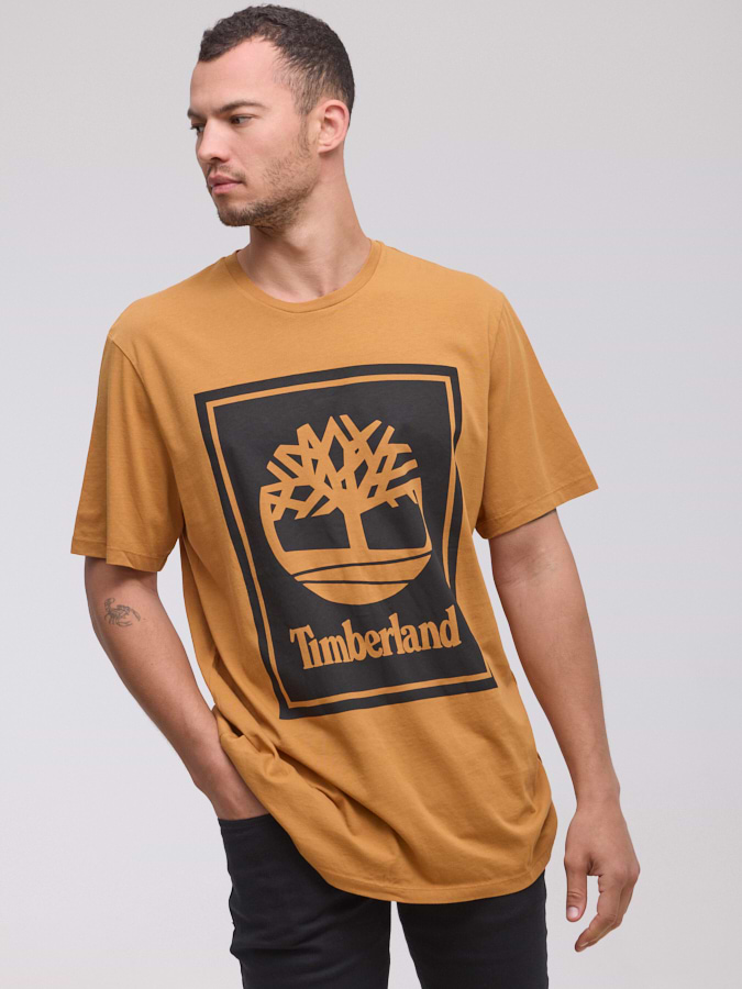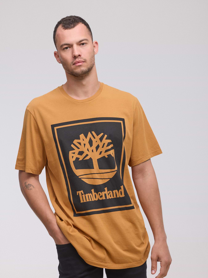 TIMBERLAND logo t shirt חולצה בצבע כתום עם ריבוע גדול שחור בחזית