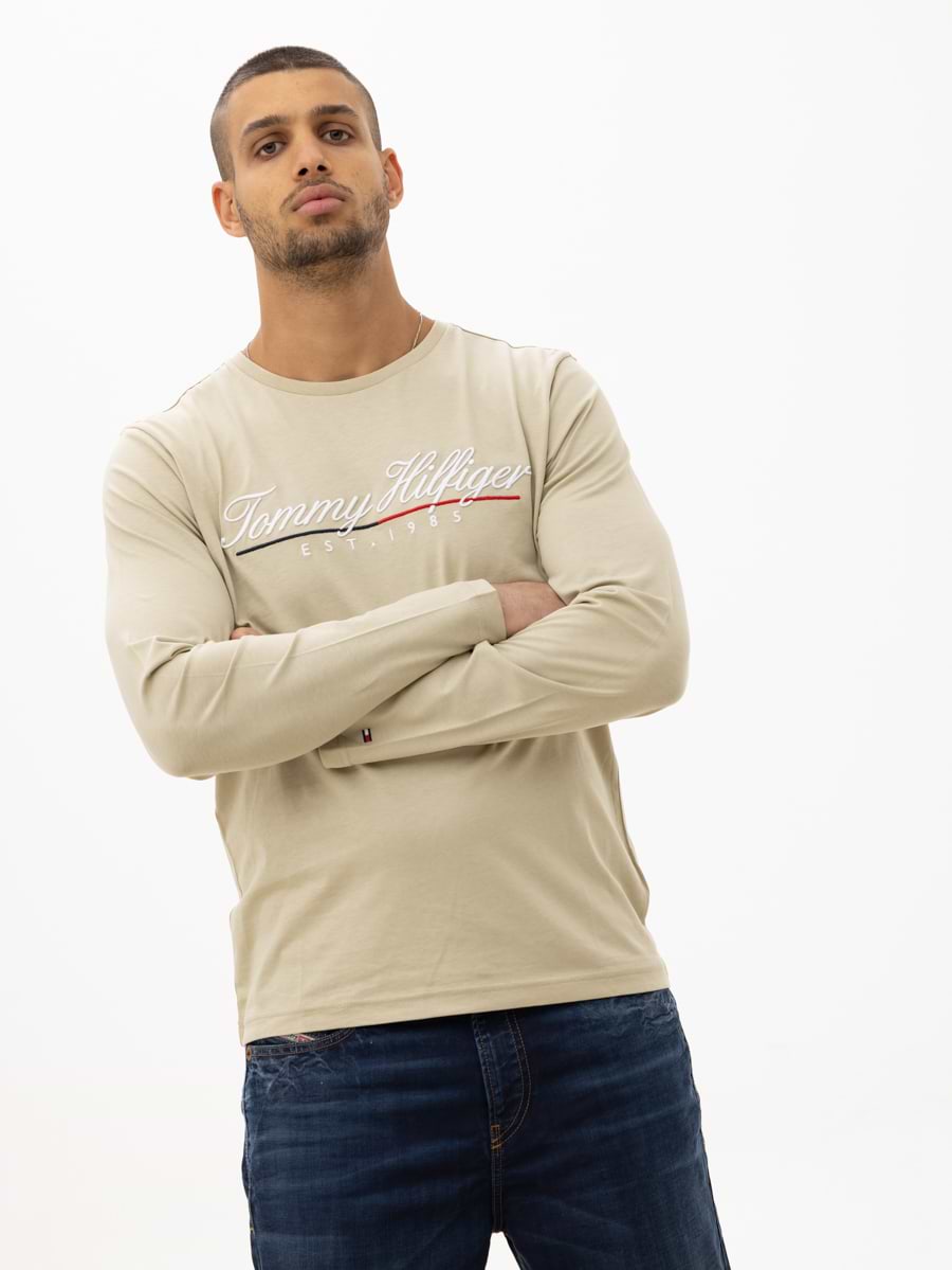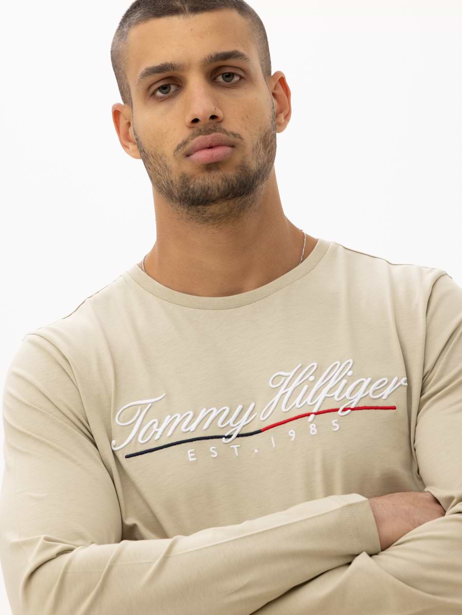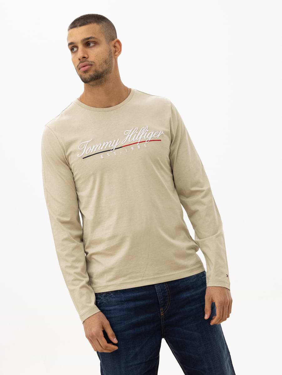 TOMMY HILFIGER beige long sleeve t shirt חולצה בצבע בז עם לוגו המותג מחובר