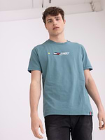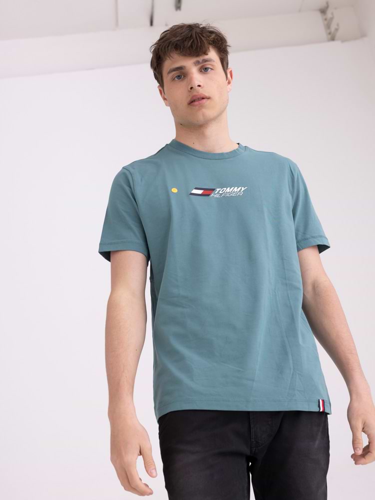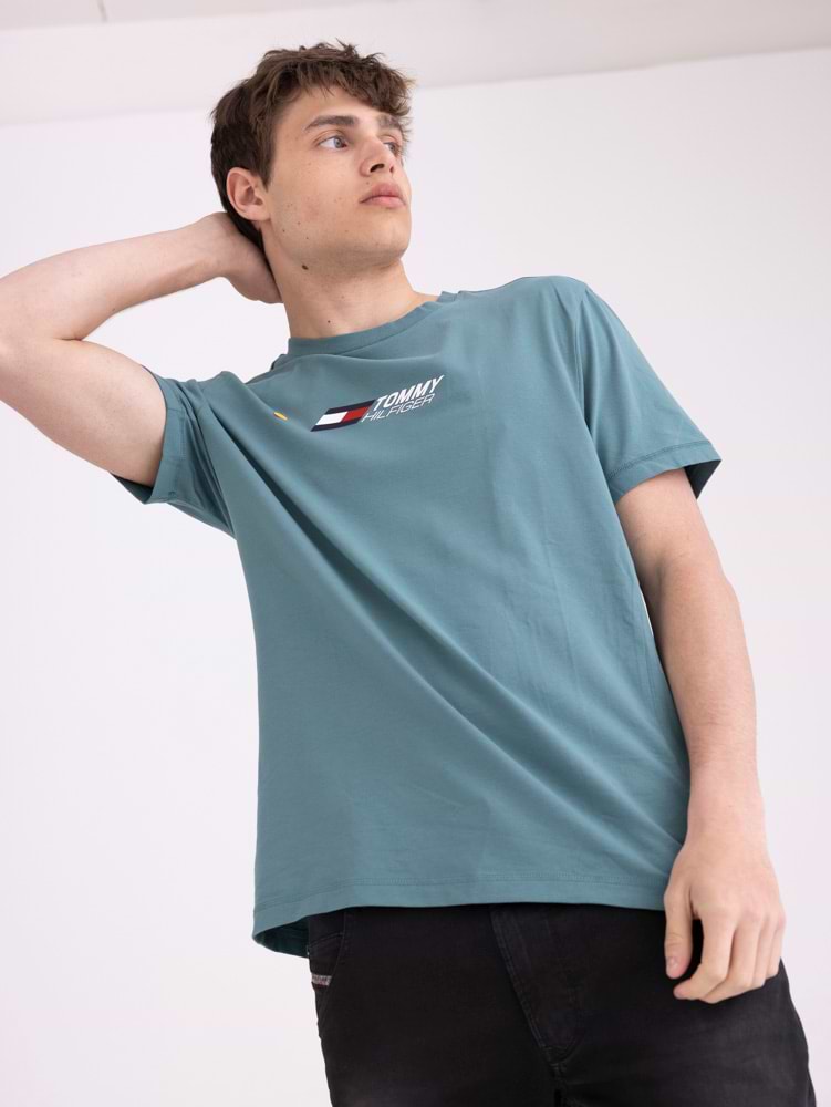 TOMMY HILFIGER blue green logo t shirt חולצה בצבע כחול מעושן לוגו מרכזי