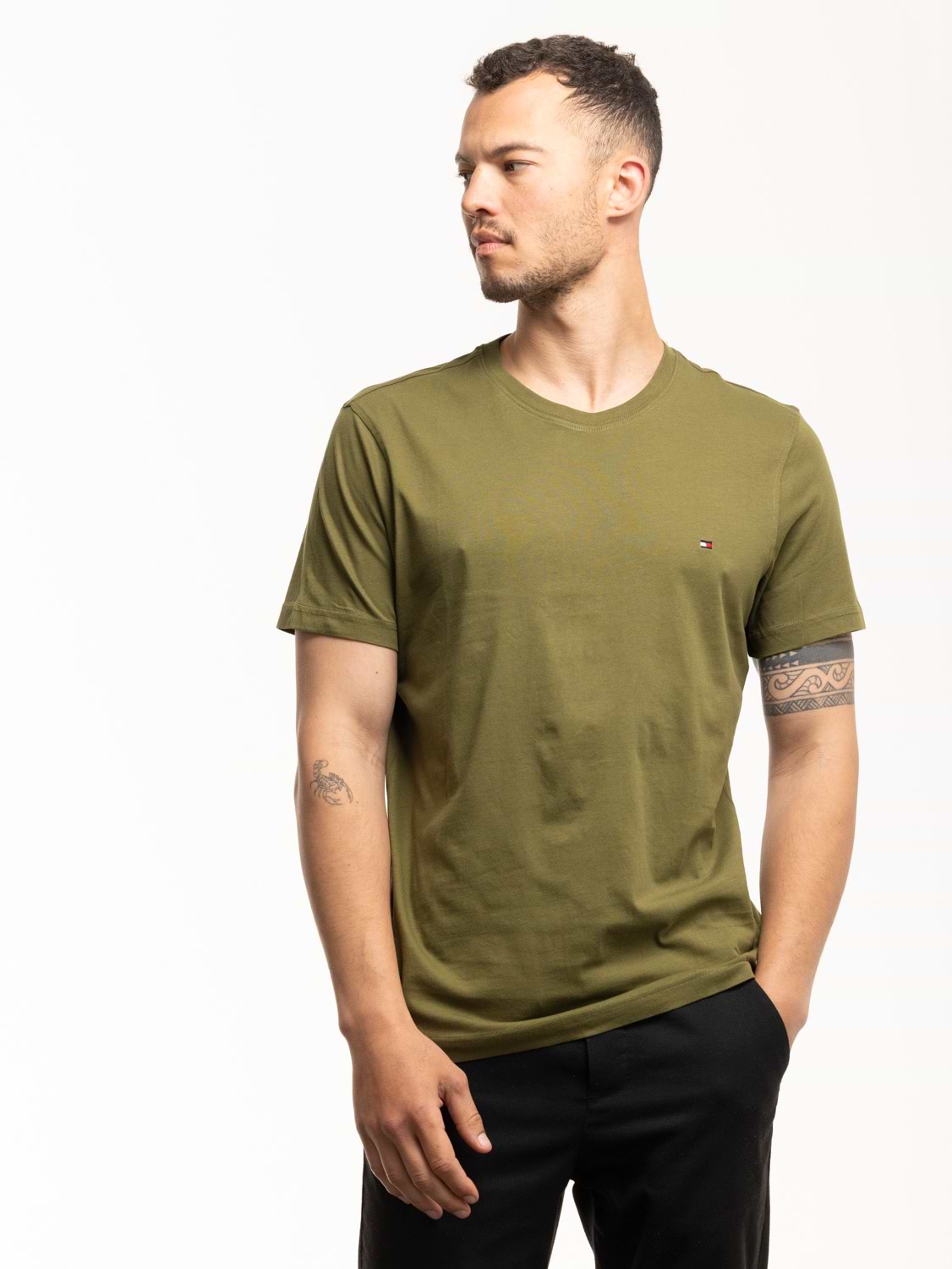 TOMMY HILFIGER green basic t shirt חולצת בייסיק בצבע ירוק עם לוגו המותג צידי (EXTRA SLIM)