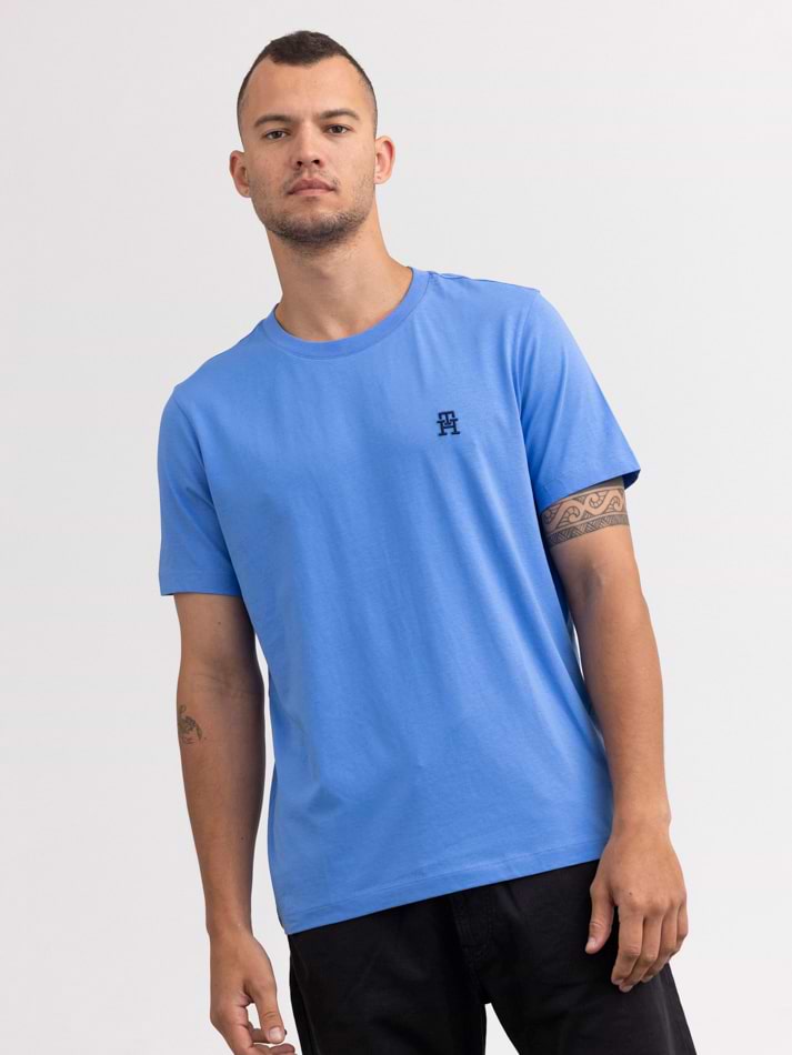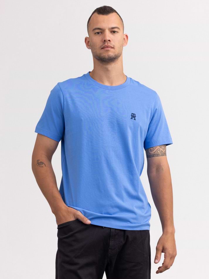 TOMMY HILFIGER light blue t shirt חולצה בצבע תכלת עם רקמה קטנה בשחור TH