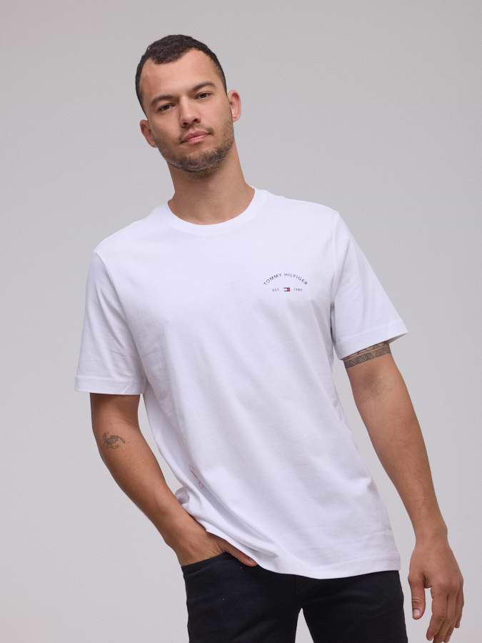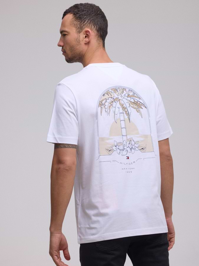 TOMMY HILFIGER logo t shirt חולצה בצבע לבן עם לוגו צידי והדפס אחורי בגב דקל