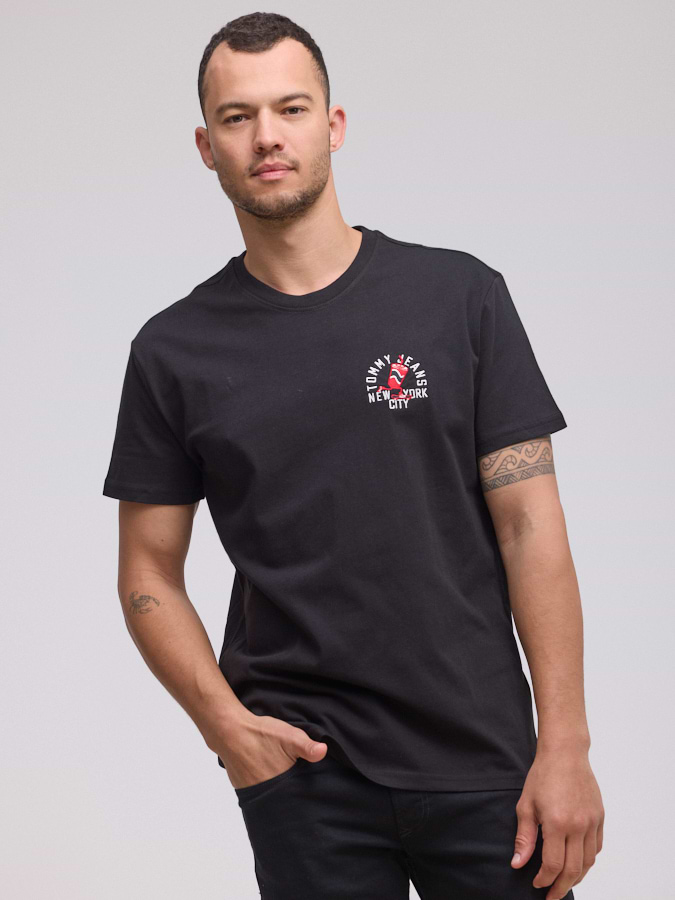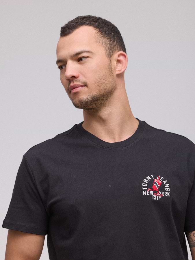 TOMMY HILFIGER logo t shirt חולצה בצבע שחור עם לוגו כוס שתייה בצד המוצר
