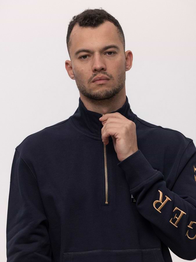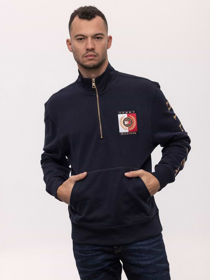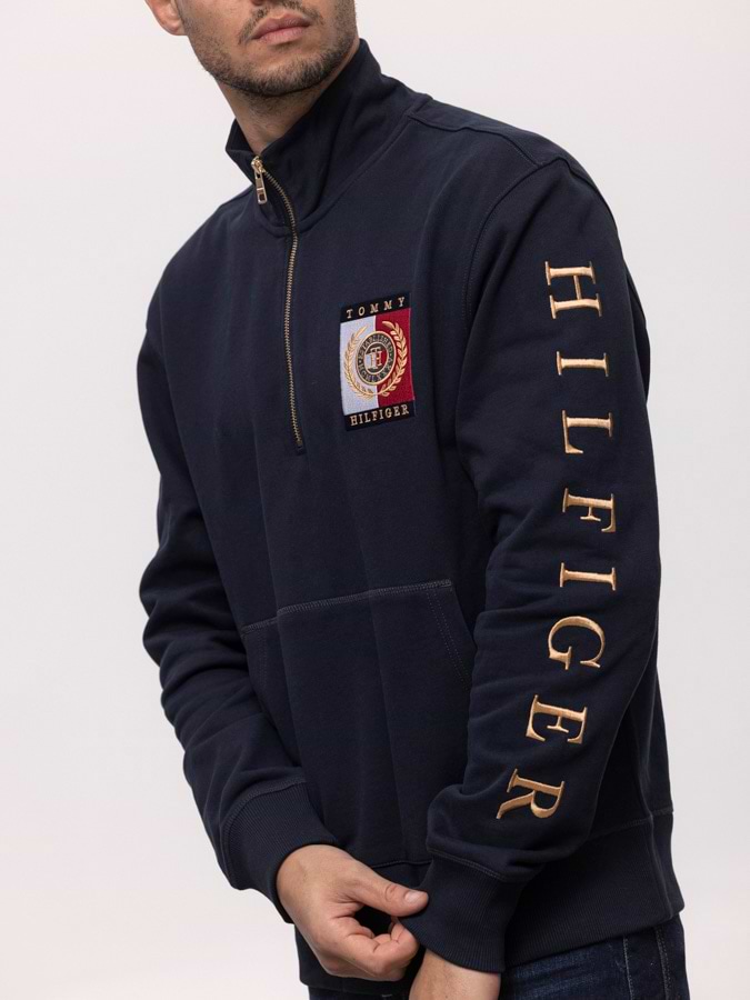 TOMMY HILFIGER navy half zip sweatshirt gold סווטשירט חצי רוכסן בצבע נייבי עם רקמה על השרוול בצבע זהב