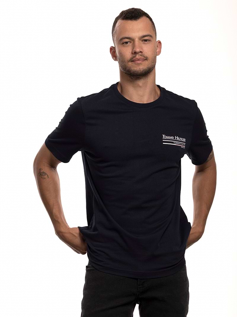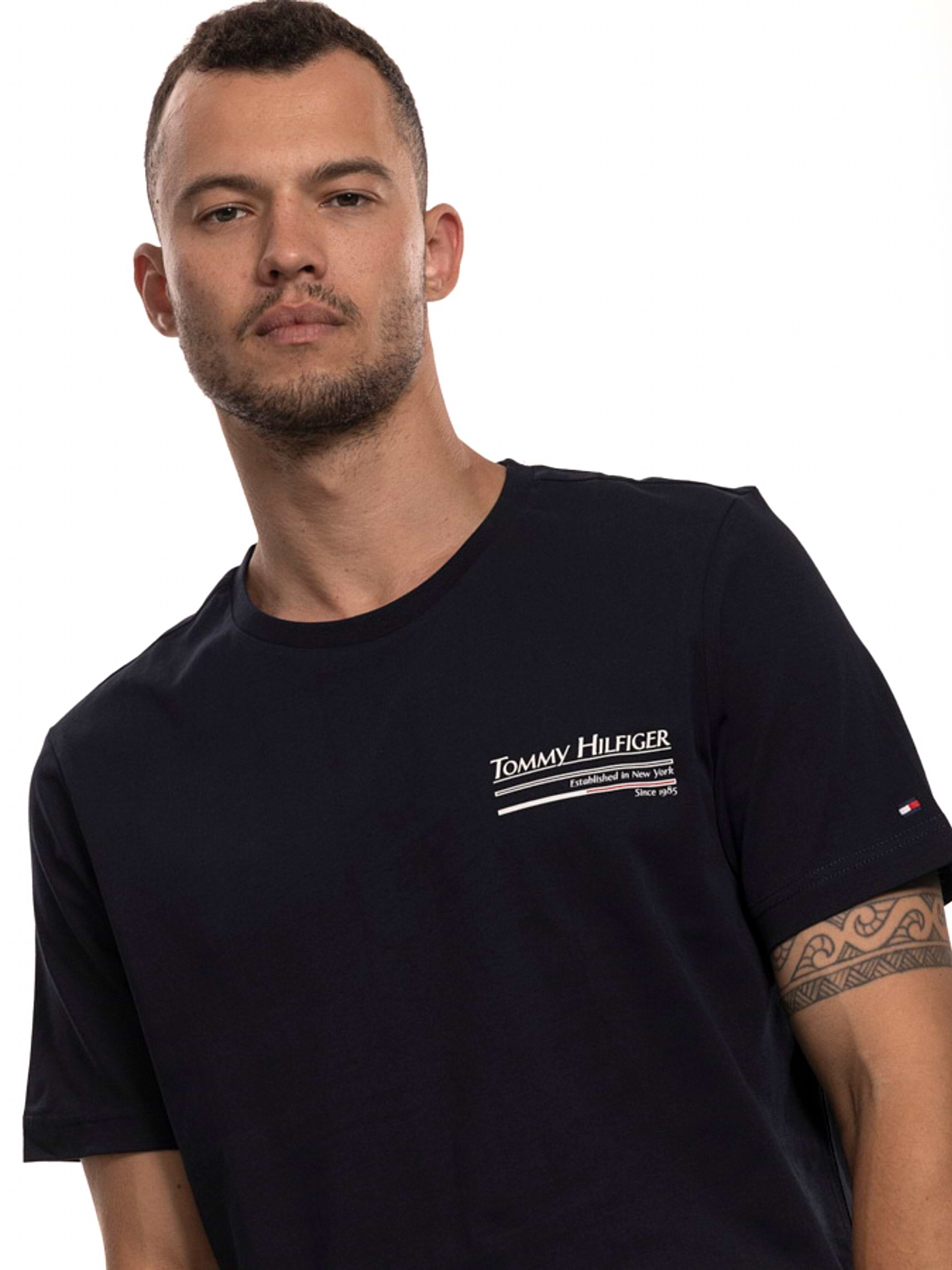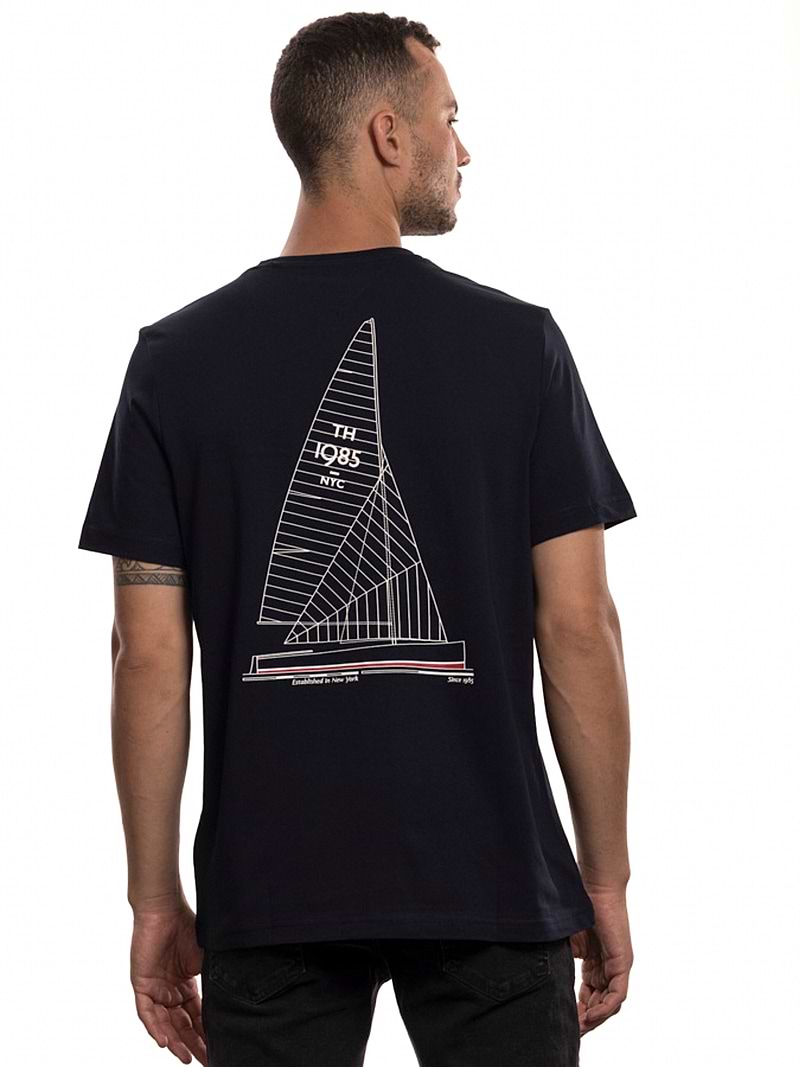 TOMMY HILFIGER navy t shirt small logo ship back חולצה בצבע נייבי עם לוגו קטן בחזית והדפס אוניה בגב