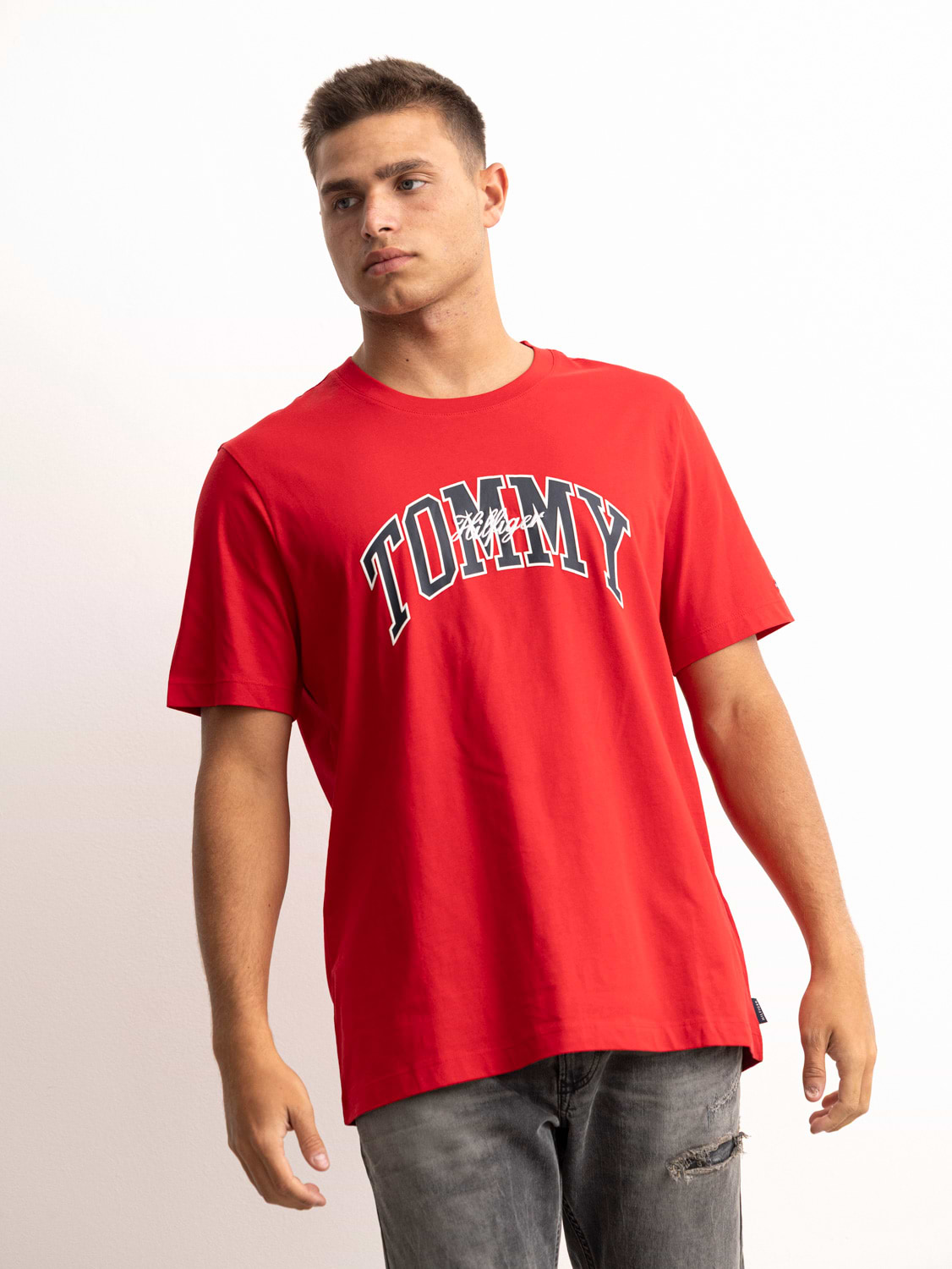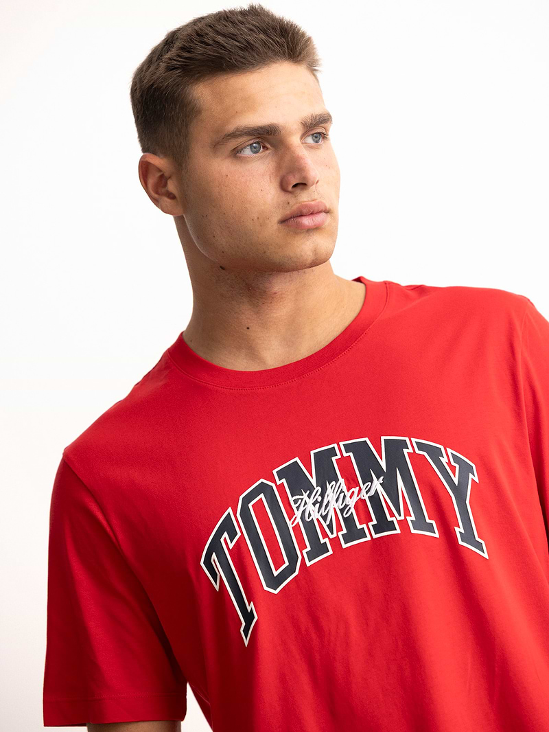 TOMMY HILFIGER t shirt red חולצה שרוול קצר עם הדפס משולב רקמה בחזית בצבע אדום